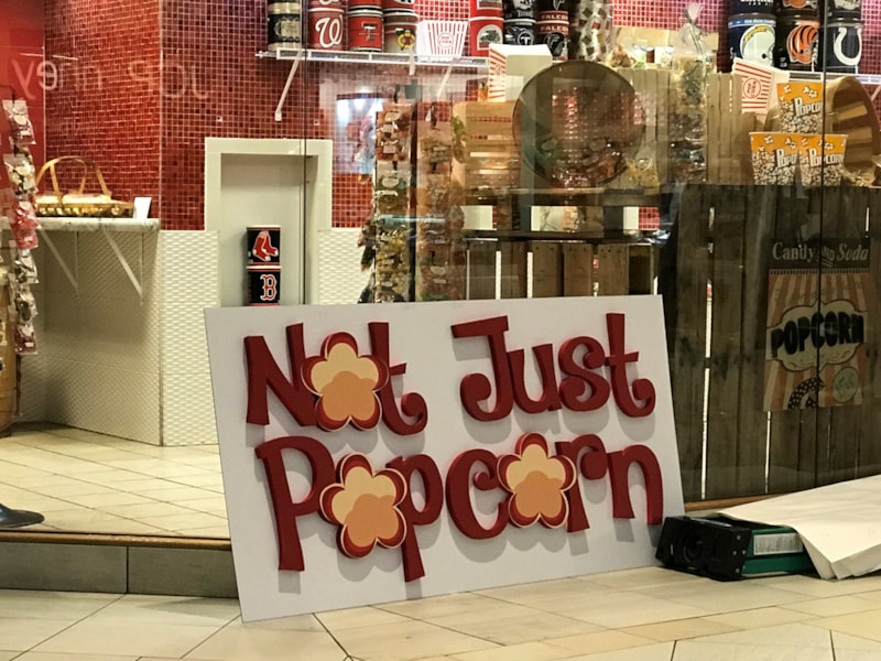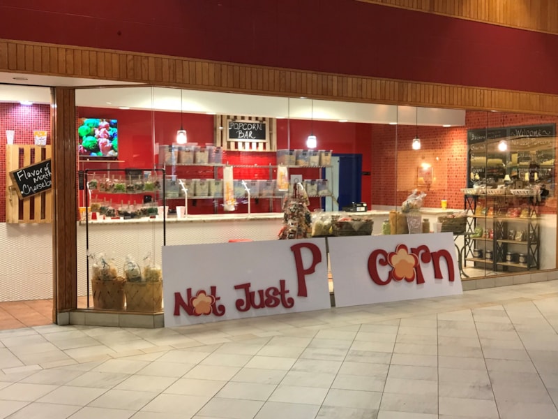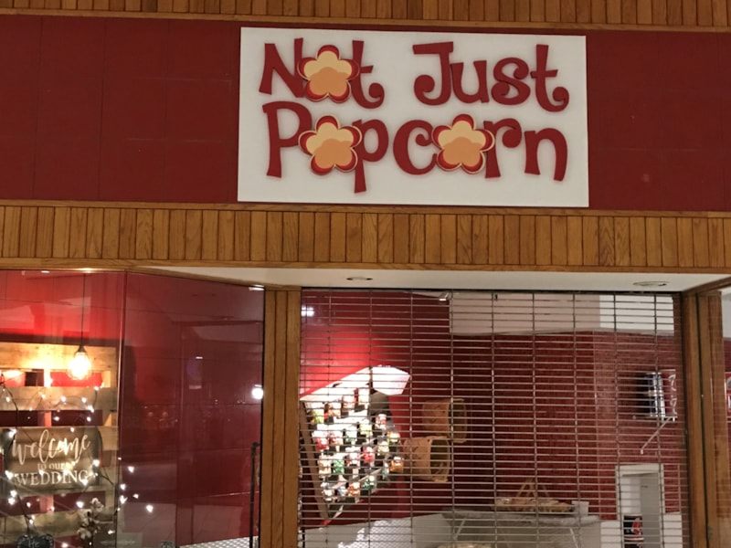 Dimensiaonal Storefront Signage for Not Just Popcorn in Greenwood Park Mall, Greenwood, IN