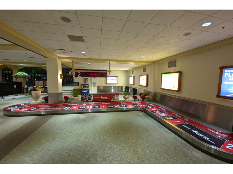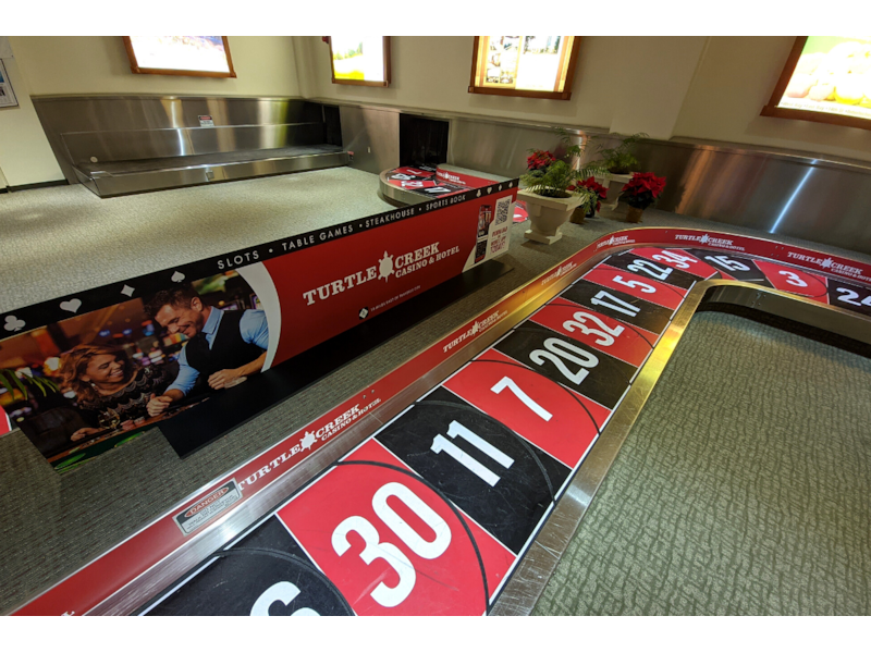 Vinyl graphics were used to turn this luggage claim into a roulette wheel at the Traverse City Cherry Capital Airport to advertise the Turtle Creek Casino and Hotel.